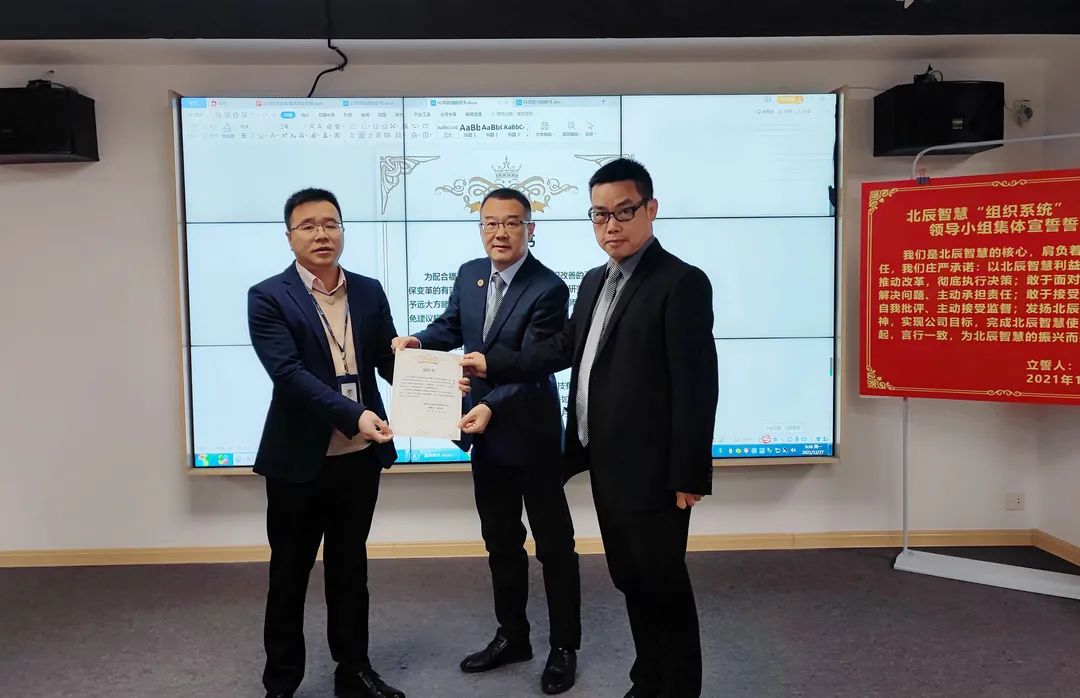 啟動會最后,潘總給咨詢項目“變革領導小組”頒發了任命書,集體進行了宣誓,大家信心滿滿,相信此次改善定能給北辰智慧帶來質的改變。