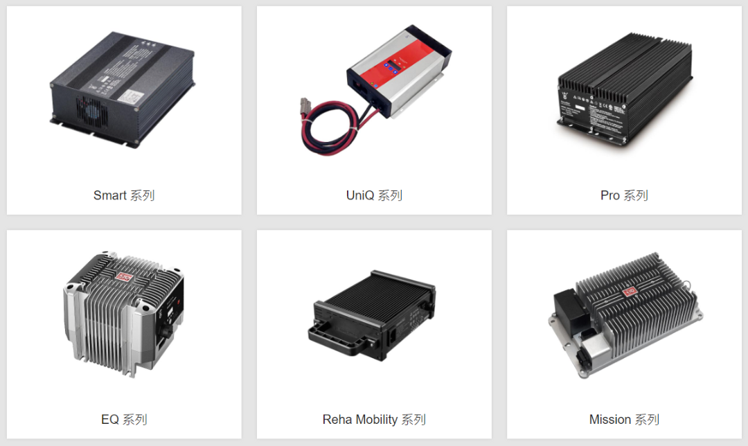 除此之外的主要標(biāo)準(zhǔn)品充電器有7大系列:Smart系列、UniQ系列、Pro系列、 EQ系列、Reha系列、Mission系列和N系列,全面覆蓋工程機(jī)械、高空作業(yè)平臺(tái),環(huán)衛(wèi)清潔車(chē)、洗地機(jī)、掃地機(jī)、AGV、機(jī)器人、輪椅、代步車(chē)、觀光車(chē)、物流叉車(chē)、園藝護(hù)理設(shè)備、農(nóng)用機(jī)械、機(jī)場(chǎng)地勤設(shè)備等領(lǐng)域以電池為動(dòng)力的設(shè)備和低速車(chē)的充電。
