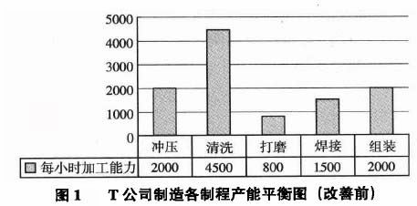 1)制造過程中由于各功能制造單位、制程產能不平衡,不可避免地造成加工能力低的制程前在制品(WIP)堆積,同時給后工站的作業帶來了極大的不便。圖1是T公司制造的一個產能平衡圖,T公司制造有沖壓、清洗、打磨、焊接、組裝共五個制程,有一個產品要順次經過這五個制程,那么這個產能如何計算呢?要看瓶頸制程的加工能力。