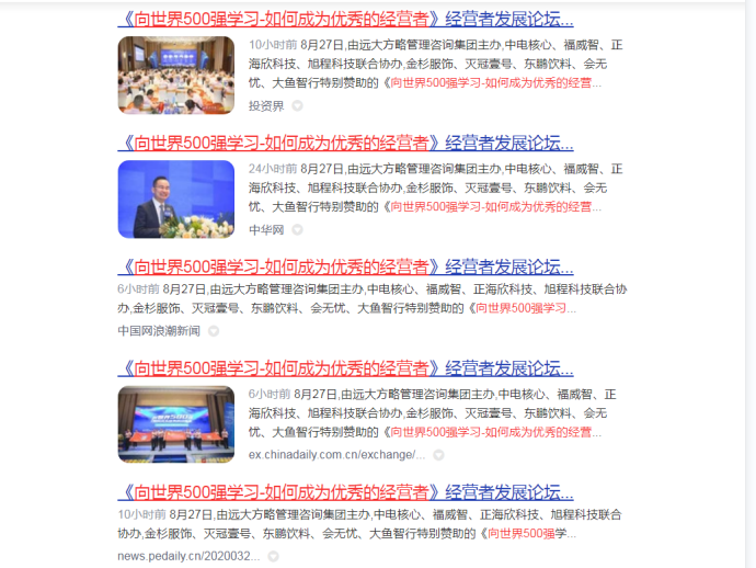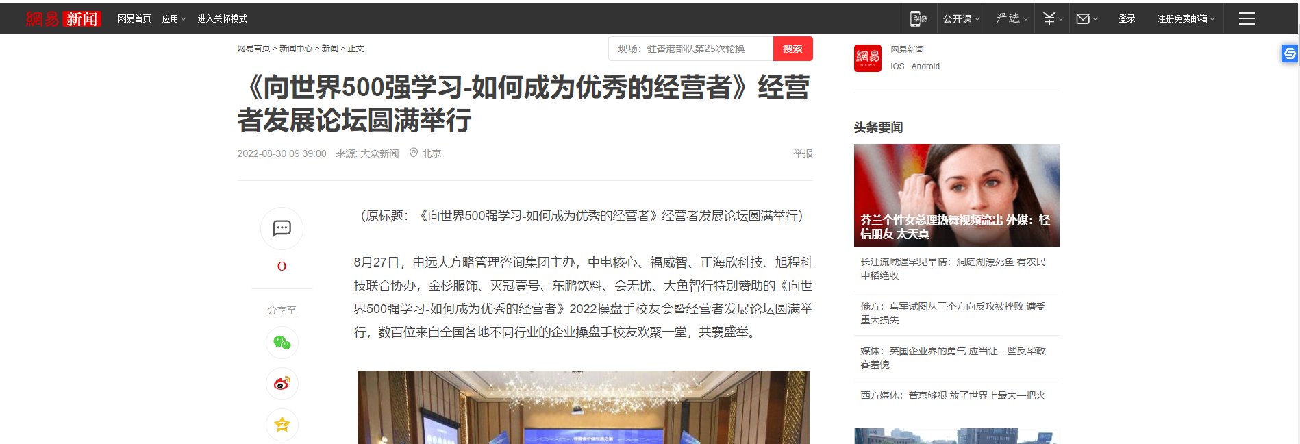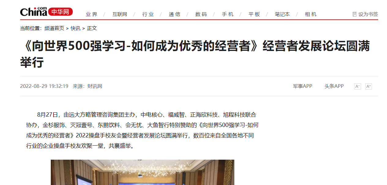 8月27日,由遠大方略管理咨詢集團主辦,中電核心、福威智、正海欣科技、旭程科技聯合協辦,金杉服飾、滅冠壹號、東鵬飲料、會無憂、大魚智行特別贊助的《向世界500強學習-如何成為優秀的經營者》2022操盤手校友會暨經營者發展論壇圓滿舉行,數百位來自全國各地不同行業的企業操盤手校友歡聚一堂,共襄盛舉。