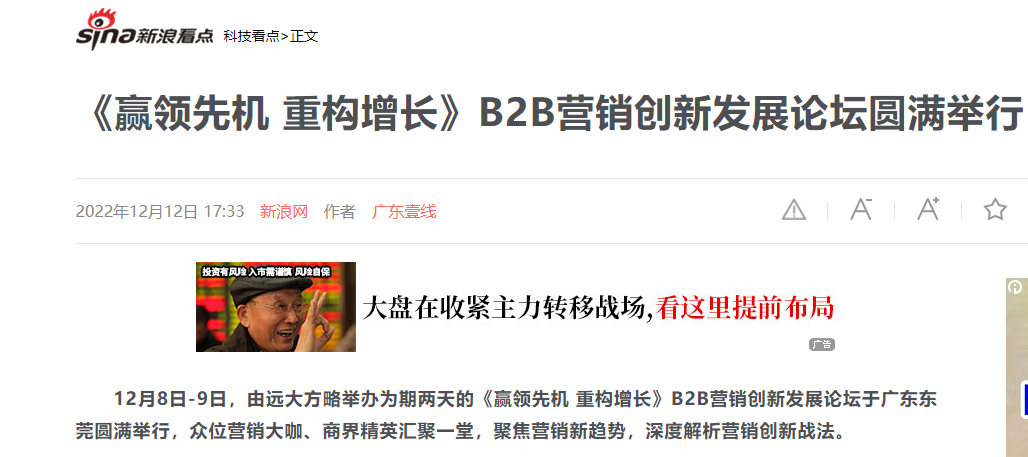 12月8日-9日,由遠大方略舉辦為期兩天的《贏領先機 重構增長》B2B營銷創新發展論壇于廣東東莞圓滿舉行,眾位營銷大咖、商界精英匯聚一堂,聚焦營銷新趨勢,深度解析營銷創新戰法。