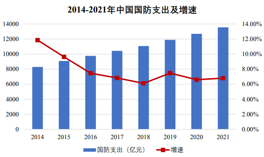 據統計,2014 年至 2021 年我國國防支出年均復合增長率為 7.27%。2021 年