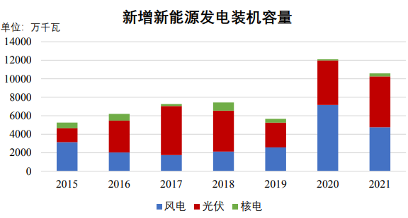 其中光伏發電和風力發電增長迅猛。2021 年度全國新能源裝機容量超過 10,000 萬千瓦,占全部電力新增裝機的 60%。近年全國新增新能源發電裝機容量情況如下圖所示: