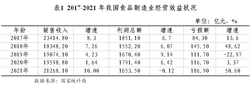 2021年,全國食品制造業(yè)銷售收入為21268.10億元,同比增長10.00%;行業(yè)利潤總額為1653.50億元,同比下降0.12%;行業(yè)虧損總額為186.90億元,同比增長50.60 %。