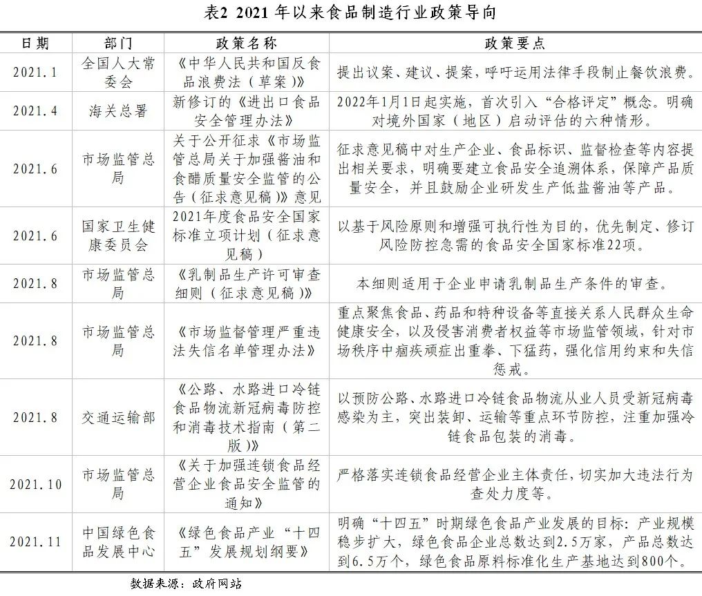 2021年,我國宏觀政策效應持續(xù)顯現(xiàn)為食品制造行業(yè)帶來積極作用,行業(yè)監(jiān)管政策主要圍繞加強食品安全監(jiān)管和推動產業(yè)健康有序地向高質量發(fā)展。