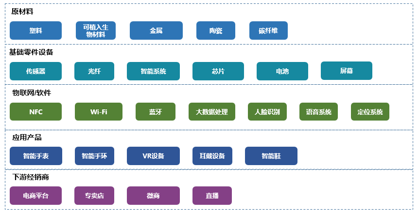 目前,可穿戴設備產業鏈包含了上游原材料,中游的基礎零件設備、物聯網/軟件、各種類型的產品(包括從芯片解決方案到外觀設計,再到生產組裝以及應用開發等一系列流程),下游經銷商等。