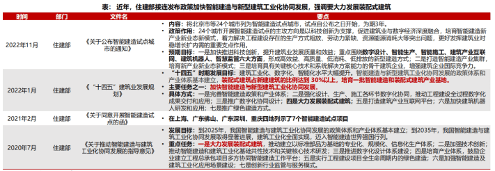 從國(guó)家政策上看,2020年7月發(fā)布了《關(guān)于推動(dòng)智能建造與建筑工業(yè)化協(xié)同發(fā)展的指導(dǎo)意見(jiàn)》;2021年2月發(fā)布了《關(guān)于同意開(kāi)展智能建造試點(diǎn)的函》;2022年1月發(fā)布了《“十四五”建筑業(yè)發(fā)展規(guī)劃》;2022年11月發(fā)布了《關(guān)于公布智能建造試點(diǎn)城市的通知》。住建部正在穩(wěn)步推進(jìn)智能建造,“十四五”建筑業(yè)發(fā)展規(guī)劃提出要求裝配式建筑占新建建筑的比例達(dá)到 30%以上,培育一批智能建造和裝配式建筑產(chǎn)業(yè)基地,裝配式建筑將成為主要的發(fā)力點(diǎn)。在“雙碳”的背景之下,建筑行業(yè)作為“碳排放大戶”,“碳達(dá)峰”任務(wù)的主要抓手,擁有碳減排的空間極大,將會(huì)成為節(jié)能減排的重要節(jié)點(diǎn)。