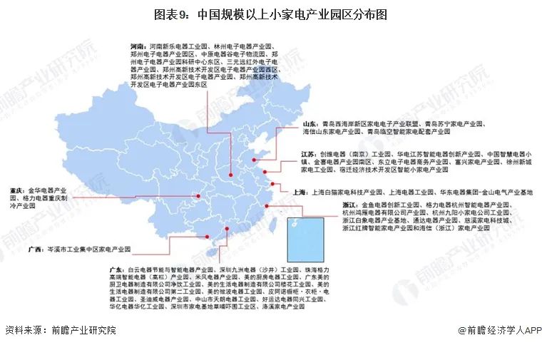 截至2022年6月中旬,我國小家電產業相關的產業園區共有86個,主要分布在廣東省、浙江省、河南省、江蘇省,其中廣東省共有22個數量第一。廣東知名小家電企業包括美的集團、新寶股份、小熊電器等。廣東小家電相關產業園包括珠海格力高端智能電器(高欄)產業園、米風電器產業園、美的廚房電器工業園、廣東美的廚衛電器制造有限公司凈飲工業園、美的生活電器制造有限公司樓花工業園、美的生活電器制造有限公司第二工業園、美的微波電器工業園、皮阿諾櫥柜·衣柜·電器工業園、圣迪威電器產業園、中山市天朗電器工業園等。