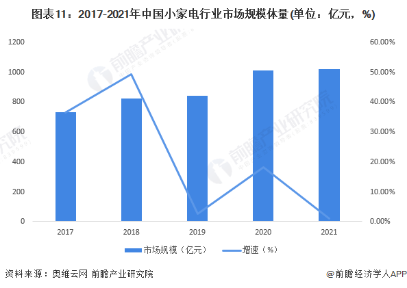 2017-2021年,中國小家電行業市場規模體量整體呈現上漲趨勢,五年間復合增長率達到8.72%。2021年,小家電行業市場規模體量達到1017億元,同比增長0.99%。2021年的小家電市場,并未延續2020年銷售熱度,這次“降溫”的出現有多方原因,其中廚房類產品銷售規模下滑明顯拖累了行業增速。廚房小家電自2019年以來已步入飽和初期,大盤增長開始疲弱,2020年受疫情防控影響“宅經濟”火熱,像催化劑一般,加速小家電市場飽和;短期來看,2021年消費者為謀生計,外出工作,下廚頻次降低,需求減少,更新減少,使得廚房小家電市場規模出現負增長,拖累了小家電行業整體規模增速。整體來看,小家電行業自2019年后增速已下降明顯,市場規模呈現降速上漲。