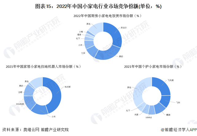 根據各市場主體主營產品的類型差異,中國小家電行業可以劃分為三個競爭派系。廚房小家電領域的主要參與者有美的集團、蘇泊爾、九陽股份、松下電器等;家居小家電產品主要包括掃地機器人、洗地機、無線吸塵器等產品,參與者包括科沃斯、石頭科技、小米科技、云鯨等品牌;個護小家電產品主要包括電吹風、電動剃須刀、電動牙刷等產品,市場參與者包括戴森、飛利浦、飛科電器、松下電器、USMILE等。