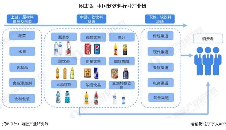 軟飲料產業鏈的上游環節為原材料供應及包裝環節,原材料供應主要是提供制造飲料所必須的農副產品和食品添加劑,農副產品包括蔬菜、水果、乳制品;食品添加劑包括甜味劑、微量元素、安賽蜜、食用香精、食用色素等。軟飲料產業鏈的中游環節為軟飲料制造,根據軟飲料的不同種類可以大致將軟飲料分為瓶(罐)裝飲用水、碳酸飲料、果汁、茶飲料等。產業鏈下游環節為流通環節,主要的銷售渠道有傳統渠道、現代渠道、餐飲渠道和電商渠道等。