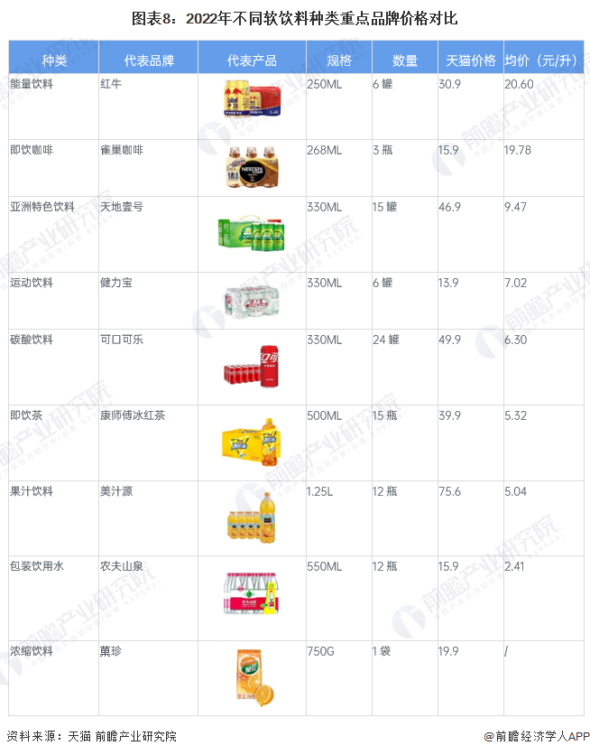 從軟飲料各大重點品牌價格對比中可以看出,包裝飲用水作為成本最低的軟飲料,均價在幾類軟飲料中最低僅為2.41元/升;以紅牛為代表的能量飲料和以雀巢咖啡為代表的即飲咖啡價格最高,均價分別達20.60元/升和19.78元/升;亞洲特色飲料排名第三,均價接近10元/升,在軟飲料中價格偏高。