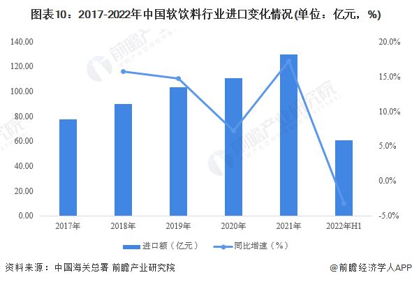 2017-2021年,中國軟飲料進口金額持續增長,增速呈波動趨勢。2020年受疫情影響,軟飲料進口增速達到近5年低點,僅7.2%,隨后在2021年大幅回升至17.3%,2021年全年軟飲料進口金額為129.61億元。2022年上半年,中國軟飲料進口規模為60.78億元,同比下降3.2%。