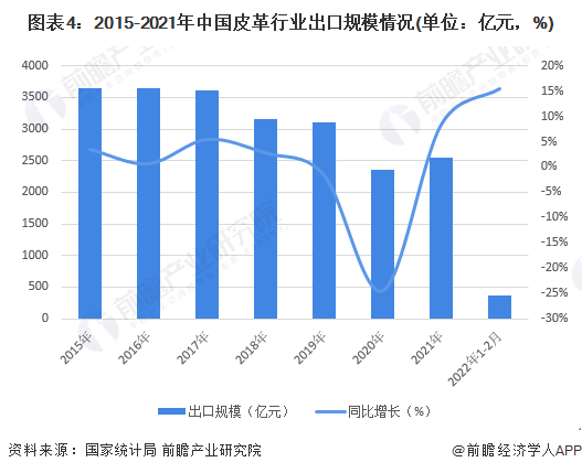 我國(guó)是全球皮革制造行業(yè)主要的生產(chǎn)地和出口地,2015-2018年,全國(guó)皮革出口規(guī)模逐年增長(zhǎng);2019年受到中美貿(mào)易摩擦的影響,有小幅下降;2020年受新冠疫情的影響,全國(guó)皮革行業(yè)出口總額同比下降超過(guò)20%;2021年皮革出口市場(chǎng)逐漸回溫,全年皮革產(chǎn)品出口總額超過(guò)2500億元,同比增長(zhǎng)超過(guò)8%。