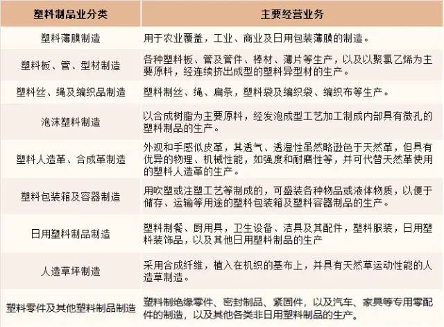 塑料制品業(yè)又稱塑料加工業(yè),系我國輕工業(yè)的支柱產(chǎn)業(yè)之一,與我國國民經(jīng)濟發(fā)展息息相關(guān)。根據(jù)加工工藝和產(chǎn)品細(xì)分領(lǐng)域的不同,塑料制品業(yè)又可分為:塑料薄膜制造;塑料板、管、型材制造;塑料絲、繩及編織品制造;泡沫塑料制造;塑料人造革、合成革制造;塑料包裝箱及容器制造;日用塑料制品制造;人造草坪制造;塑料零件及其他塑料制品制造。