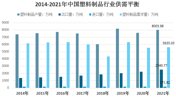 根據(jù)海關數(shù)據(jù),2021年我國塑料制品行業(yè)進口171.82萬噸,出口2540.77萬噸,結(jié)合國內(nèi)產(chǎn)量來看,2021年我國塑料制品行業(yè)表觀需求量達到5635.03萬噸。