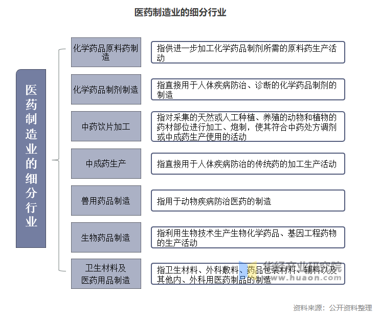2、細分行業(yè):醫(yī)藥制造業(yè)具體可以細分為化學藥品原料藥制造、化學藥品制劑制造、中藥飲片加工、中成藥生產(chǎn)、獸用藥品制造、生物藥品制造和衛(wèi)生材料及醫(yī)藥用品制造七個行業(yè)。我國醫(yī)藥制造企業(yè)是指以藥品研發(fā)、生產(chǎn)及銷售為主的企業(yè)。根據(jù)具體藥品生產(chǎn)業(yè)務線的不同,《中國高技術產(chǎn)業(yè)統(tǒng)計年鑒》將我國醫(yī)藥制造業(yè)分為三大種類:化學藥品制造、生物藥品制造和中成藥制造。