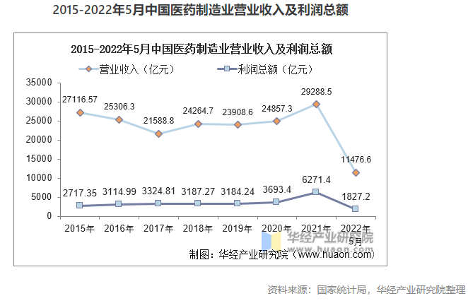 2016年,醫(yī)藥制造業(yè)由于受到一系列政策調(diào)控和企業(yè)轉型的影響,藥品價格受到嚴格監(jiān)管和控制,行業(yè)整體營業(yè)收入出現(xiàn)下滑,隨后市場競爭環(huán)境改善,營業(yè)收入逐漸恢復增長趨勢,2021年中國醫(yī)藥制造業(yè)的營業(yè)收入為29288.5億元,利潤總額為6271.4億元,利潤率為21.4%,截至2022年5月,我國醫(yī)藥制造業(yè)2022年利潤率為15.9%。