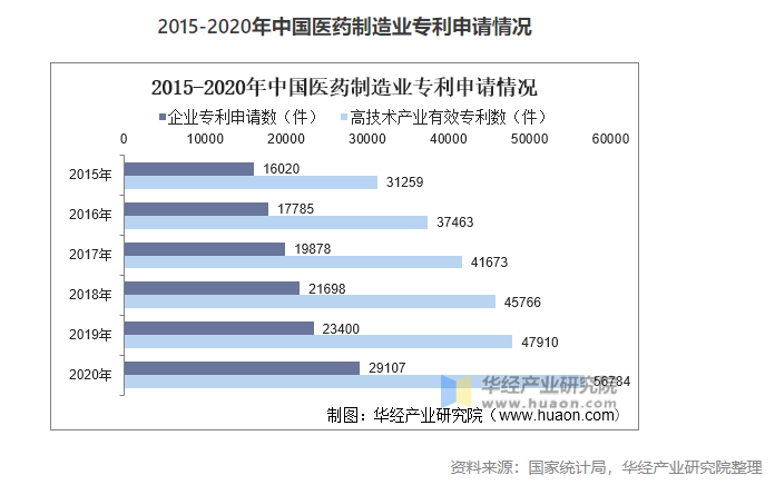 作為技術含量最高的行業(yè)之一,醫(yī)藥制造業(yè)必須不斷投入新藥品的研發(fā),提升行業(yè)整體創(chuàng)新能力和研發(fā)水平,才能提高醫(yī)藥制造業(yè)的競爭力。根據(jù)國家統(tǒng)計局數(shù)據(jù)顯示2020年我國醫(yī)藥制造業(yè)企業(yè)專利申請數(shù)為29107個,高技術產(chǎn)業(yè)專利有效數(shù)56784件,同比增長18.7%