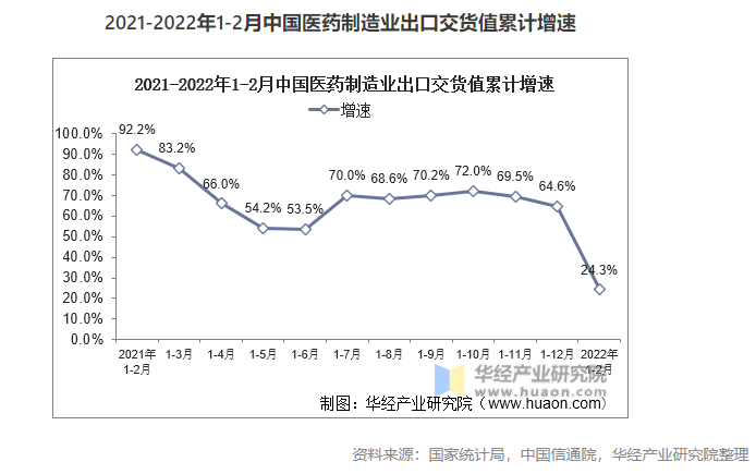 出口交貨值保持較快增長態(tài)勢。受海外疫情持續(xù)爆發(fā)影響,防疫物資產(chǎn)品出口需求強勁,支撐醫(yī)藥制造業(yè)出口保持較快增長。截至2022年1-2月,醫(yī)藥制造業(yè)出口交貨值同比增長24.3%,在去年高基數(shù)的情況下繼續(xù)保持高速增長,較工業(yè)平均水平高7.4個百分點