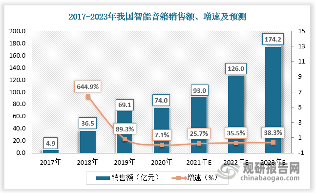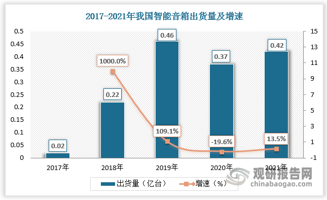 數(shù)據(jù)顯示,2019年我國智能音箱出貨量達0.46億臺,較上年同比增長109.1%;2020年受疫情影響以及廠商價格補貼力度的減小,我國智能音箱出貨量有所下降,為0.37億臺,增速為-19.6%;2021年隨著疫情向好以及市場受到智能家居設(shè)備使用增加的推動,國內(nèi)智能音箱出貨量回升,約為0.42億臺,增速為13.5%。