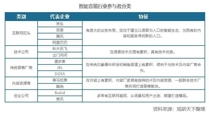 2011年美國亞馬遜開始了智能音箱的研發(fā),并于2014年發(fā)布了Echo智能音箱,由此智能音箱行業(yè)起步發(fā)展。隨后谷歌、蘋果等相繼發(fā)布智能音箱產(chǎn)品,行業(yè)進入爆發(fā)式增長階段。2015年京東聯(lián)合科大訊飛推出的叮咚智能音箱則是國內(nèi)智能音箱行業(yè)的先行者,此后隨著行業(yè)向好,參與者不斷增多,主要分為互聯(lián)網(wǎng)巨頭、技術(shù)公司、傳統(tǒng)音箱廠商、內(nèi)容資源商、創(chuàng)業(yè)公司五大類。