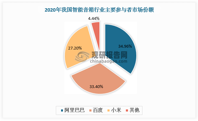 從市場集中度來看,我國智能音箱行業(yè)集中度高,且呈現(xiàn)不斷加強趨勢。數(shù)據(jù)顯示,2019-2020年我國智能音箱市場CR3由92.7%上升至95.6%。從競爭格局看,智能音箱市場呈現(xiàn)阿里巴巴、百度、小米三足鼎立市場格局,2020年市場份額分別為34.96%、33.4%、27.2%。