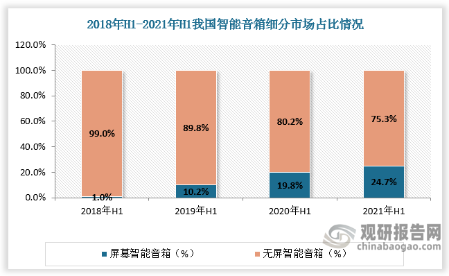從細分市場看,智能音箱分為屏幕音箱和無屏音箱,近年來隨著智能音箱技術(shù)水平提升,產(chǎn)品智能程度提高,屏幕音箱占比逐漸提升,2021年H1達24.7%,較2018年H1增長23.7個百分點。