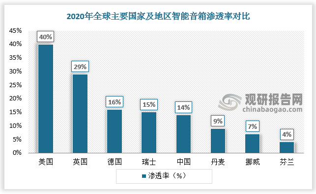 2017-2020年,國內(nèi)智能音箱市場零售額由4.9億元增長至74億元,2021年H1我國智能音箱行業(yè)市場規(guī)模達46.5億元,較上年同期增長30.6%,我國智能音箱進入迅猛增長階段。但從滲透率來看,2020我國智能音箱滲透率(14%)排名全球第五,銷售規(guī)模仍有較大的提升空間。未來,隨著智能音箱廠商向下沉市場拓展,預(yù)計2023年我國智能音箱銷售額達到174.2億元。