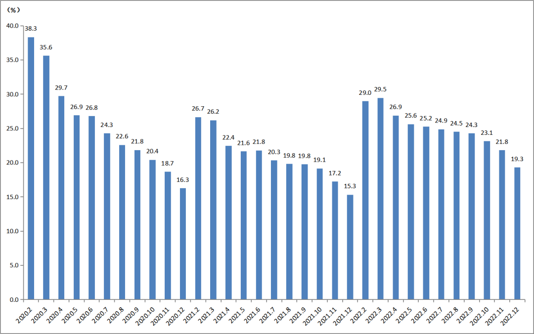 2022年12月底,印刷業規模以上企業的虧損面為19.3%,虧損企業的虧損總額增長了28.3%。由圖4可見,自3月以來虧損面逐步減少,12月有明顯減幅。但與上年相比,虧損面明顯上了一個臺階,如12月19.3%的虧損面相比上年同期抬高了4個百分點。