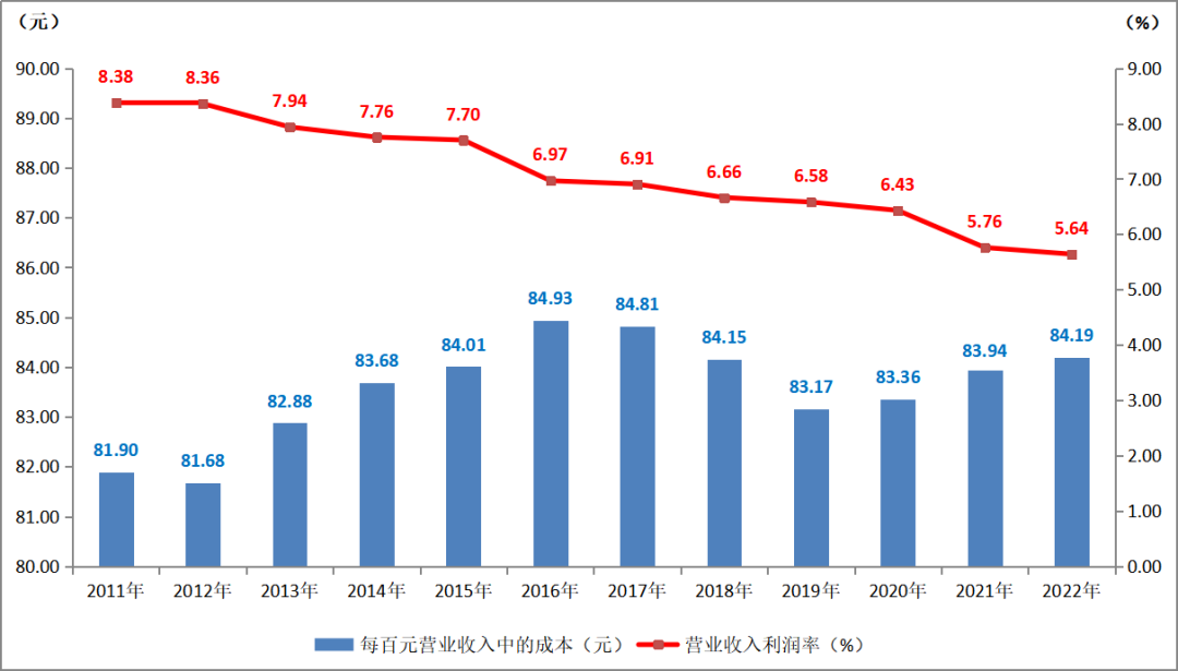 2022年,印刷業每百元營業收入中的成本為84.19元,低于全部工業84.72元的平均水平。這一數字,相比上年的83.94元,有所提升。