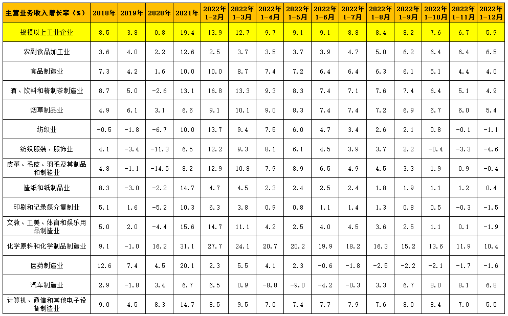 表中顯示,2022年全部工業主營業務收入平均增長為5.9%,各月累計增速呈逐步下降態勢。