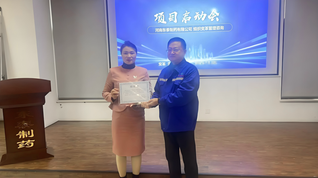 為促進項目的有效落地,明確各崗位職責,強化責任意識,會上東泰制藥苗董向遠大方略項目組頒發了授權書,馬總為各位老師頒發了聘書,此次授權和任命不僅體現了東泰制藥對咨詢團隊的高度信任,也彰顯了公司破除阻力、推動變革的決心。
