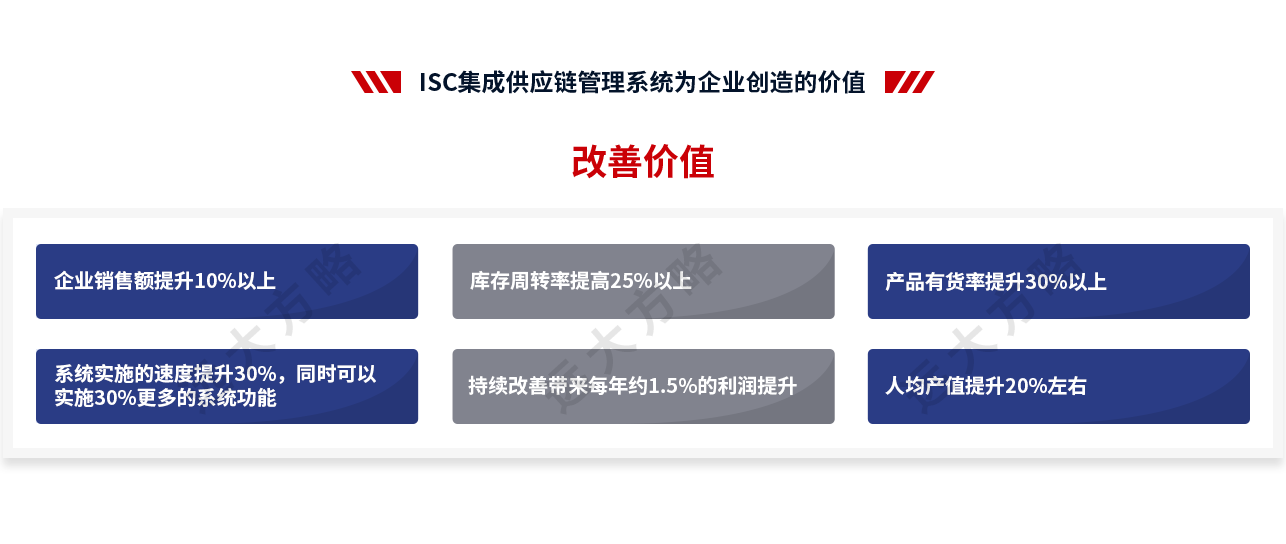 3、數據增長:打造高效供應鏈咨詢項目,通過提高交付的可靠性與靈活性,提升客戶的滿意度;通過降低庫存、減少生產及分銷的費用,降低公司成本;通過流程優化、消弭異常事件,提升企業整理的流程品質。實現:人均產值提升22%,訂單交付及時率提升33%,供應鏈周期縮短21%,庫存周轉速率提升23%,供應鏈響應速度提升32%。